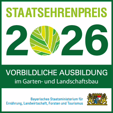 Bereits zum dritten Mal in Folge erhielten wir 2026 erneut den Staatsehrenpreis für vorbildliche Ausbildung, welcher durch die bayerische Landesregierung vergeben wurde. Wir sind sehr stolz, diese Auszeichnung weiterhin besitzen zu dürfen. Sie motiviert uns, auch weiterhin intensiv für junge Menschen einzustehen und uns für die Ausbildung im Garten- und Landschaftsbau zu engagieren.