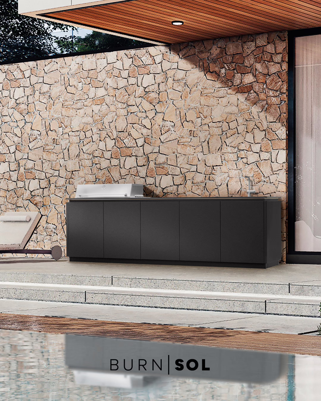 Bei BURNOUT BBQ & LUX verbinden sich die Vorzüge einer Indoorküche mit der Widerstandskraft einer hundertprozentigen Outdoorküche, die Tag und Nacht bei Wind und Wetter draußen stehen kann. BurnoutLUX zeichnet sich durch ein neues Design-Level aus: Sockel, Glaselemente in den Auszügen, reduzierte Griffelemente, tiefschwarzer Look- nicht nur für Korpus und Fronten, sondern auch für Grills und Spüle. Gradlinige Formensprache, Modulbauweise, filigrane Details und ein durchgängiger Schwarzton über alle Elemente und Materialien hinweg zeigen, dass eine Outdoorküche nicht nur praktisch und rustikal sein muss, sondern für zeitloses Design stehen kann.
